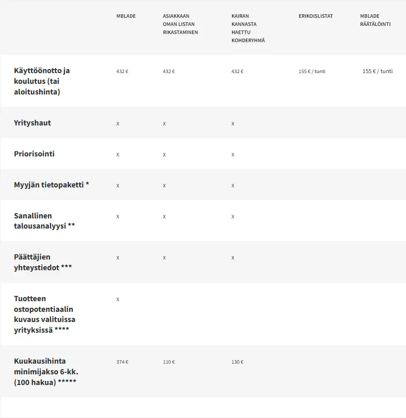 ***** Mblade-tuotteessa haku tarkoittaa yrityshakua, analyysejä, yhteystietoja ja yritysvertailuja
